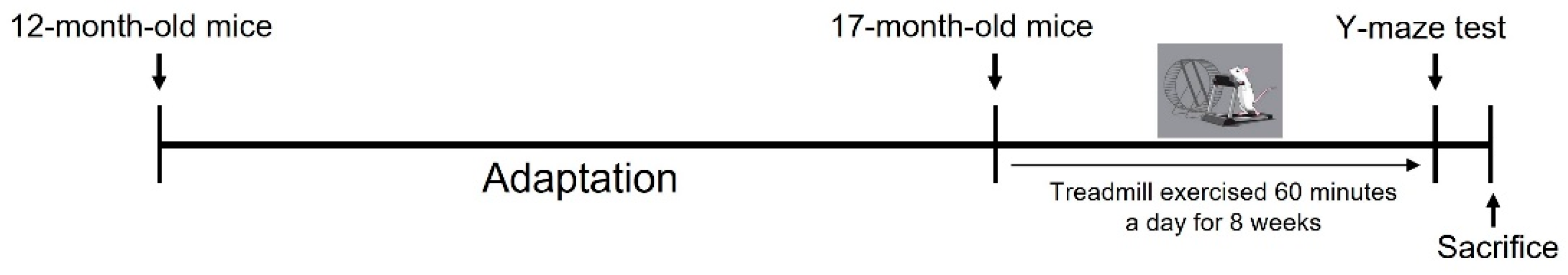 The 17-month-old mice in the exercise group underwent a treadmill training regimen for 60 min per day, 5 days a week, over the course of 8 weeks. Prior to each session, mice were allowed 3 to 5 min to acclimate to the treadmill environment. The exercise protocol was structured in three phases: the first 10 min at a speed of 5 m/min on a 0° incline, the following 10 min at 8 m/min on a 0° incline, and the final 40 min at 10 m/min on a 0° incline. Mice were randomly assigned to the exercise training group before the start of the regimen to ensure unbiased allocation (Figure 1).