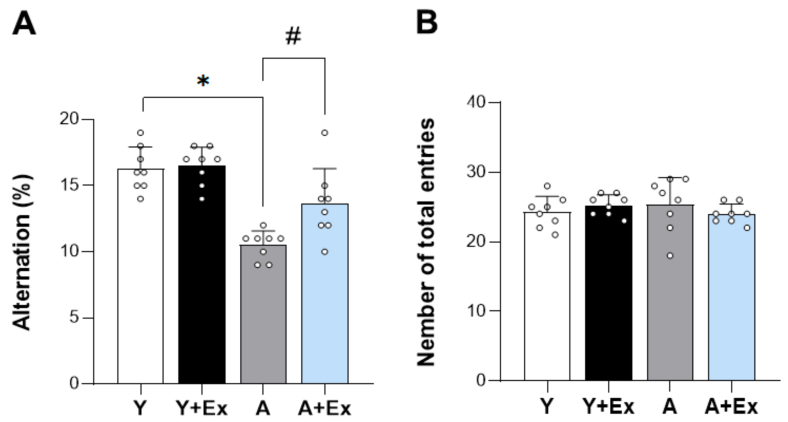 Figure 2. Effect of exercise on aging-induced cognitive impairment using the Y-maze test. This figure shows the impact of exercise on cognitive performance in aged mice, assessed using the Y-maze test. (A) The spontaneous alternation percentage (%) was significantly improved in aged mice that underwent exercise compared to aged mice without exercise, indicating enhanced cognitive function. (B) There were no significant differences in the total number of entries among all groups, suggesting that motor function remained unchanged. Data are presented as the mean ± standard deviation (SD), reflecting the biological variability within each group. * indicates p < 0.05 compared with the young group; # indicates p < 0.05 compared with the aging group. The following groups were used in the study: Young Control (Y, 9 weeks old, n = 6), Young + Exercise Training (Y + Ex, 9 weeks old, n = 6), Aging Control (A, 17 months old, n = 6), and Aging + Exercise Training (A + Ex, 17 months old, n = 6).
