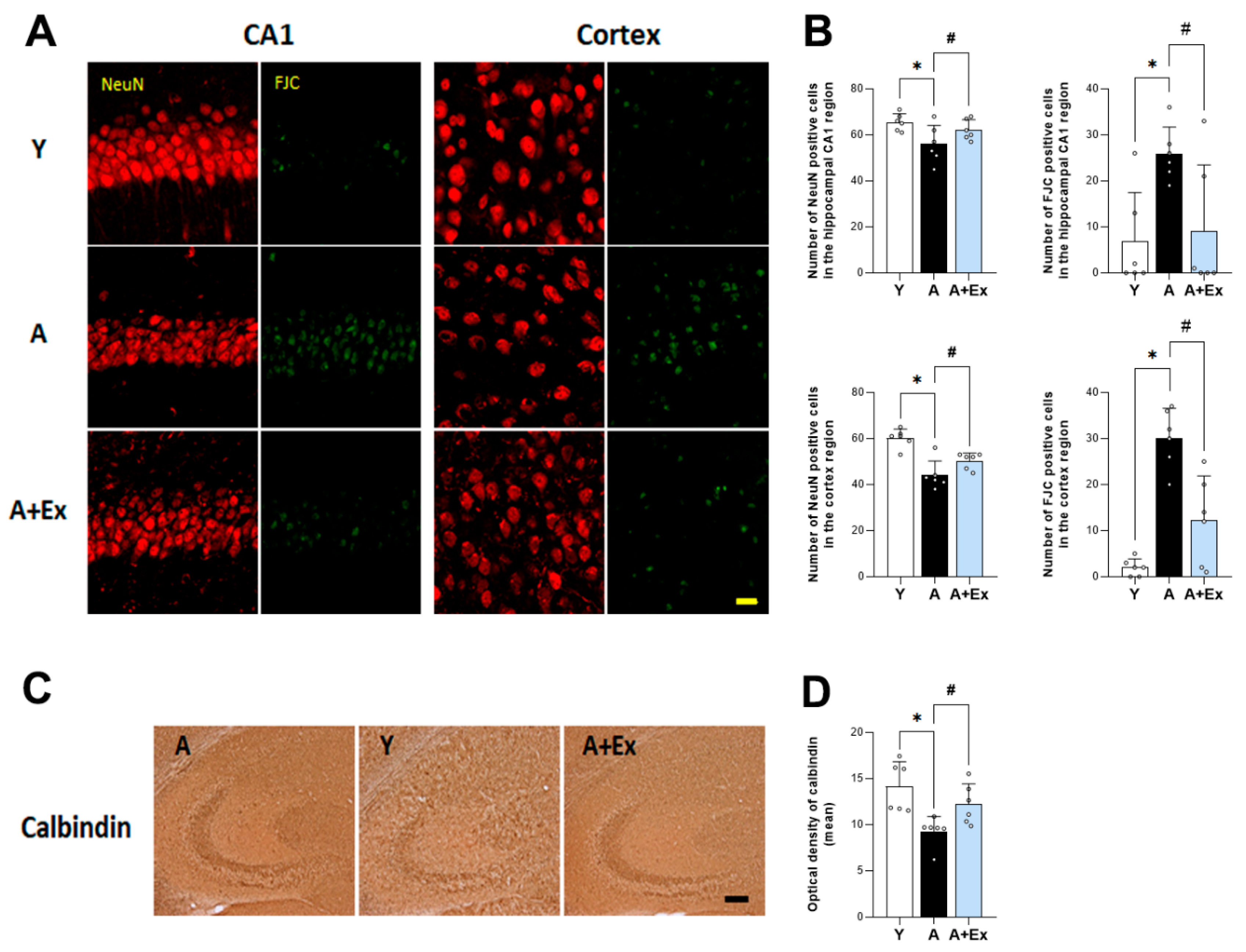 Figure 3. Effect of exercise on aging-induced neuronal death in the hippocampus and cortex regions. (A) Representative images of immunostaining for NeuN-positive cells and Fluoro-Jade C (FJC) in the hippocampal CA1 and cortex regions, illustrating the effects of aging. (B) Aged mice demonstrated a reduced number of neurons and an increased number of degenerative neurons in these regions. However, exercise in aged mice ameliorated neuronal death in both the hippocampal CA1 and cortex regions. (C) Representative images of immunostaining show changes in calbindin expression due to aging and exercise intervention. (D) Aged mice demonstrated reduced calbindin expression in the hippocampal CA3 region. However, exercise in aged mice improved calbindin expression in the hippocampal CA3 region. Data are presented as the mean ± standard deviation (S.D * indicates p < 0.05 compared with the young group; # indicates p < 0.05 compared with the aging group. Scale bar represents 50 μm (A), 200 μm (C). The following groups were used: young control (Y, 9 weeks old, n = 3), aging control (A, 17 months old, n = 3), and aging + exercise training (A + Ex, 17 months old, n = 3).