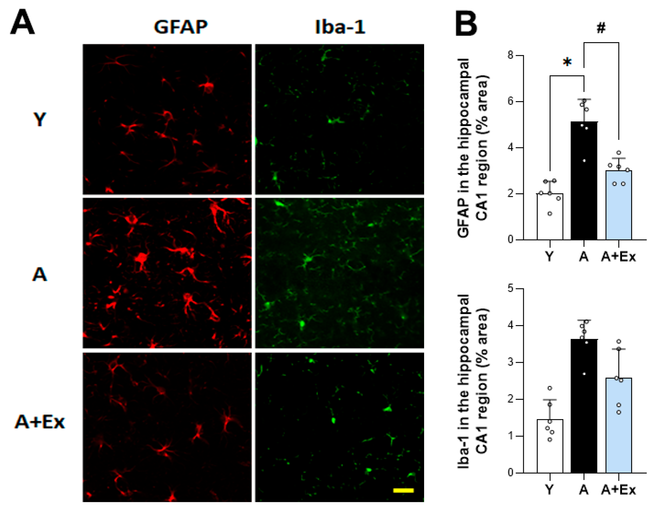 Figure 4. Effect of exercise on aging-induced microglia and astrocyte activation in the hippocampal CA1 region. (A) Representative images of immunostaining for GFAP and Iba-1 expression in the hippocampal CA1 region, illustrating changes in microglia and astrocyte activation. (B) Aged mice exhibited increased activation of microglia and astrocytes. However, exercise in aged mice reduced this activation in the hippocampal CA1 region. Data are presented as the mean ± standard deviation (S.D.). * indicates p < 0.05 compared with the young group; # indicates p < 0.05 compared with the aging group. Scale bar represents 50 μm. The following groups were used: young control (Y, 9 weeks old, n = 3), aging control (A, 17 months old, n = 3), and aging + exercise training (A + Ex, 17 months old, n = 3).