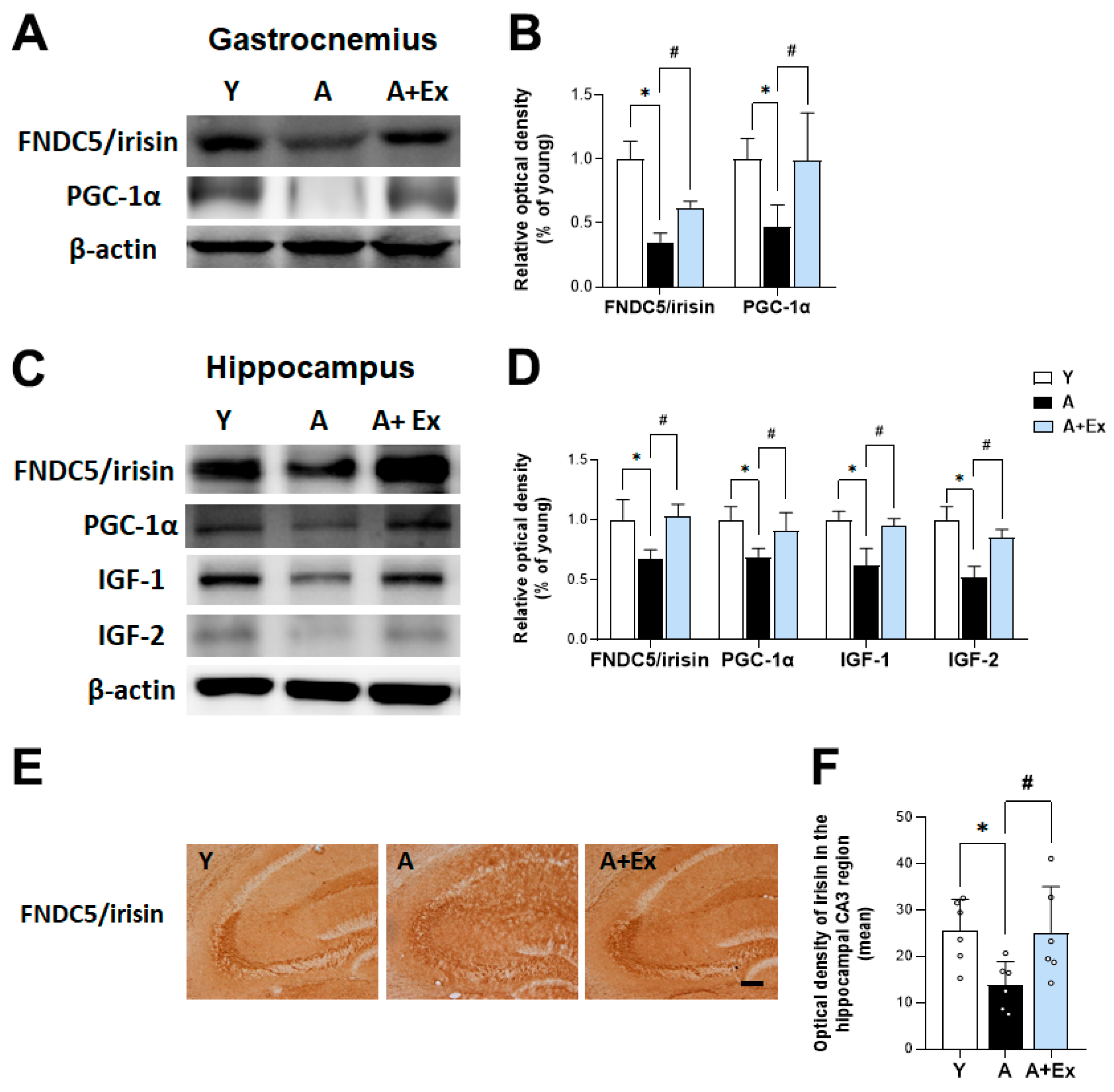 Figure 5. Effects of exercise on FNDC5/irisin and PGC-1α expression in the hippocampus and gastrocnemius. (A,C) Representative bands showing the protein expression of FNDC5/irisin, PGC-1α, IGF-1, and IGF-2 in the hippocampus and gastrocnemius muscle. (B,D) Aging resulted in decreased expression of FNDC5, PGC-1α, IGF-1, and IGF-2 in both the hippocampus and gastrocnemius compared to young mice. However, exercise intervention significantly improved the expression of these proteins in the hippocampus. Similarly, exercise increased the expression of FNDC5/irisin and PGC-1α in the gastrocnemius muscle. (E,F) Representative images of immunostaining illustrate changes in FNDC5/irisin expression due to aging and exercise intervention. Data are presented as the mean ± standard deviation (S.D.). * indicates p < 0.05 compared with the young group; # indicates p < 0.05 compared with the aging group. The scale bar represents 200 μm. The following groups were used: young control (Y, 9 weeks old, n = 3), aging control (A, 17 months old, n = 3), and aging + exercise training (A + Ex, 17 months old, n = 3).