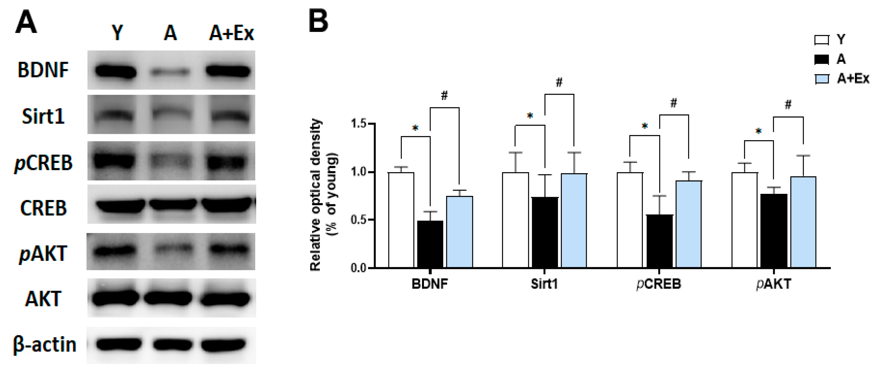 Figure 6. Effects of treadmill exercise on BDNF/Sirt1/CREB/AKT signaling pathway in the hippocampus. (A) Representative bands show the protein expression of BDNF, Sirt1, pCREB, and pAKT in the hippocampus. (B) Aging resulted in decreased expression of these proteins compared to young mice. However, exercise intervention significantly improved the expression of BDNF, Sirt1, pCREB, and pAKT in the hippocampus. Data are presented as the mean ± standard deviation (S.D.). * indicates p < 0.05 compared with the young group; # indicates p < 0.05 compared with the aging group. The following groups were used: young control (Y, 9 weeks old, n = 3), aging control (A, 17 months old, n = 3), and aging + exercise training (A + Ex, 17 months old, n = 3).