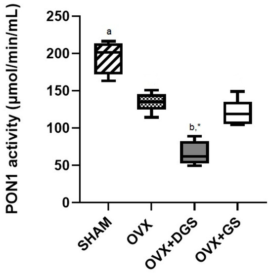 It has been shown in some animal models that PON1 can prevent the harmful effects of oxidative stress on serum, and that serum levels of PON1 correlate with levels of HDL and apolipoprotein AI, although this correlation is not strong. We might suggest that increased PON1 activity is a consequence of higher HDL levels. In our study, the lower value of PON1 activity in the ovariectomized groups compared to SHAM rats can be attributed to estrogens, given that estradiol enhances PON1 activity [57]. In addition, a pro-oxidative environment could lead to an increase in the binding of free radicals to PON1, resulting in a less active enzyme in circulation [58]. It has been reported that dietary factors have a significant effect on PON1 activity, specifically polyunsaturated fatty acids [59], which could be associated with higher activity in the OVX + GS group compared to the OVX + DGS group. Furthermore, according to the observed results of apo and PON activity, the OVX + DGS group could be a population at risk for the development of cardiovascular disease.