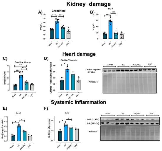 Cardio-renal syndrome development blood markers. Evaluation of the renal damage markers (A) creatinine and (B) blood urea nitrogen (BUN) at 10 days after surgery in plasma. The results are expressed in milligrams per deciliter (mg/dL). (C) Creatine Kinase and cardiac troponin (D) were evaluated as cardiac damage markers. Creatine kinase activity is expressed in nanomoles per minute per milliliter of plasma (nmol/min/mL). Plasma evaluation by Western blot of pro-inflammatory cytokines and their densitometry: (E) interleukin one beta (IL-1β) and (F) interleukin six (IL-6). Ponceau S staining of the corresponding membranes was used as a protein loading control. Data are the mean ± SEM, with n = 6–3. * p < 0.05, ** p < 0.01, and *** p < 0.001. NX = 5/6 nephrectomy. NAC = N-acetylcysteine.
