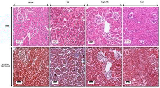 Representative micrographs of kidney histology. In comparison to the SHAM and NAC groups that show normal kidney histology, NX rats show small proximal convoluted tubules covered by a cuboidal or flat epithelium that corresponds to tubular atrophy; some of these tubules show hyaline cylinders in their lumen. There are focal interstitial chronic inflammatory infiltrates with slight fibrosis demonstrated in the Masson trichrome-stained section (arrow). These histological changes are clearly reduced in NAC+NX rats. NX = 5/6 nephrectomy. NAC = N-acetylcysteine.