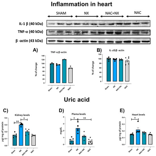 Inflammatory cytokines and uric acid levels. Evaluation of pro-inflammatory cytokines in heart tissue by Western blotting and their densitometry at 10 days after surgery: (A) interleukin one beta (IL-1β) and (B) tumor necrosis factor alpha (TNF-α). β-Actin of the corresponding membranes was used as a control. Evaluation of uric acid levels in (C) the kidneys, (D) plasma and (E) heart. Data are the mean ± SEM, with n = 5–6. * p < 0.05; ** p < 0.01. NX= 5/6 nephrectomy. NAC = N-acetylcysteine.