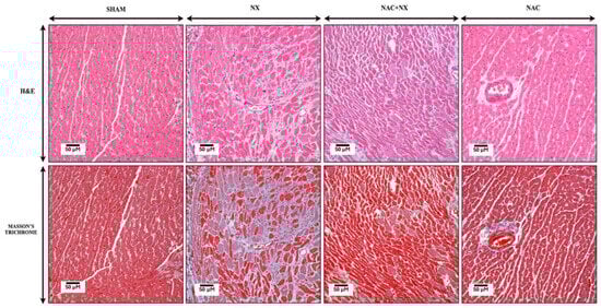NAC pre-administration also prevented histological and inflammatory alterations, as observed by H&E and Masson trichrome staining, in the heart (Figure 4). In the case of cardiac function (Table 2), all other parameters were unchanged during diastole (Figure 5 and Table 2). The NAC+NX 5 group also demonstrated notable improvements in FS and the EF, reaching levels comparable to the Sham group (Table 2). Concerning stroke volume (SV) and end-systolic volume (ESV), NAC pretreatment enhanced both parameters to values like those observed in the Sham group (Figure 5 and Table 2). In contrast to SF and the EF, cardiac output (CO) and heart rate did not change between the experimental groups. Finally, NAC administration alone did not cause changes in any of the echocardiographic parameters (Table 2) or histology evaluation (Figure 4).