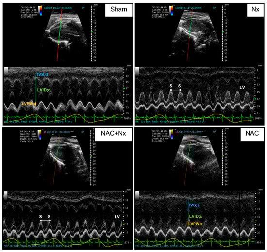 Echocardiography and functional cardiac parameters in rats. Representative paraesternal long-axis (SA) M-mode view with measurements of the left ventricular (LV) dimensions. With this parameter, it is possible to measure the LV internal diameter in diastole (LVID;d—yellow lines) and the LV internal diameter in systole (LVID;s—yellow lines). Left ventricular anterior wall thickness (LVAW) and posterior wall (LVPW) are shown in white and blue lines in diastole and systole. The heart rate is calculated using the distance between two consecutive systoles (S, white double-point arrow). NX= 5/6 nephrectomy; NAC = N-acetylcysteine.