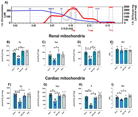 Respiratory parameters in isolated mitochondria from kidney and heart. (A) A representative graph of the method used to determine the CI and CI + CII-linked respiratory parameters in isolated mitochondria. The chamber O2 concentration is shown by the blue line, and respiratory rate is shown in red; the values are normalized per milligram of protein [pmol/(s*mg)]. Renal mitochondria respiratory parameters: (B) S3, (C) S4o, (D) P and (E) RCI. Respiratory parameters in isolated mitochondria in the heart: (F) S3, (G) S4o, (H) P and (I) RCI. Data are the mean ± SEM, with n = 5–6. * p < 0.05; ** p < 0.01. S3 = respiratory state 3, S4o = respiratory state 4 induced by oligomycin, P = respiration directly associated with OXPHOS, RCI = respiratory control index, CI = complex I, CII = complex II, PMG = pyruvate–malate-glutamate, S = succinate, Oligo = oligomycin, Rot + ant = rotenone plus antimycin A, and ROX = residual non-mitochondrial respiration. NX = 5/6 nephrectomy. NAC = N-acetylcysteine.