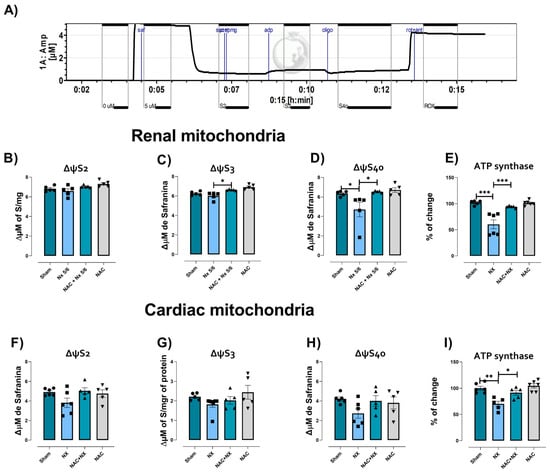Evaluation of the changes in mitochondrial membrane potential (Δψm) and ATP synthase activity in isolated mitochondria. (A) Graphic representations of the changes in safranin O fluorescence used to evaluate the changes in Δψm. Δψm changes in (B) S2, (C) S3 and (D) S4o and (E) ATP synthase activity in renal mitochondria. Δψm changes in cardiac isolated mitochondria in the respiratory state, (F) S2, (G) S3 and (H) S4o, as well as (I) ATP synthase activity in cardiac mitochondria. Data are the mean ± SEM, with n = 5–6. * p < 0.05, ** p < 0.01, and *** p < 0.001. State 2 = S3, State 3 = S3, state 4 induced by oligomycin = S4o, PMG = pyruvate–malate-glutamate, S = succinate, Oligo = oligomycin, Rot + ant= rotenone plus antimycin A, and ROX = residual non-mitochondrial respiration. NX= 5/6 nephrectomy. NAC = N-acetylcysteine.