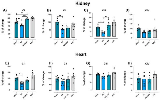 Interestingly, the separate evaluation of mitochondrial electron transport system complexes showed that after 10 days of NX, the activity of CI, CII and CIII was reduced, with no change in CIV activity in renal tissue (Figure 8A–D). This agrees with our previously reported findings that showed that CI and CIII sustain early damage in renal tissue following NX []. In this way, in the heart tissue, only CI activity was reduced in the NX group (Figure 8E), without significant changes in the rest of the mitochondrial complexes (Figure 8F–H). Together, our results suggest that in the kidney, OXPHOS reduction may be attributable to damage in several complexes; meanwhile, OXPHOS reduction in the heart may be primarily attributable to CI impairment.