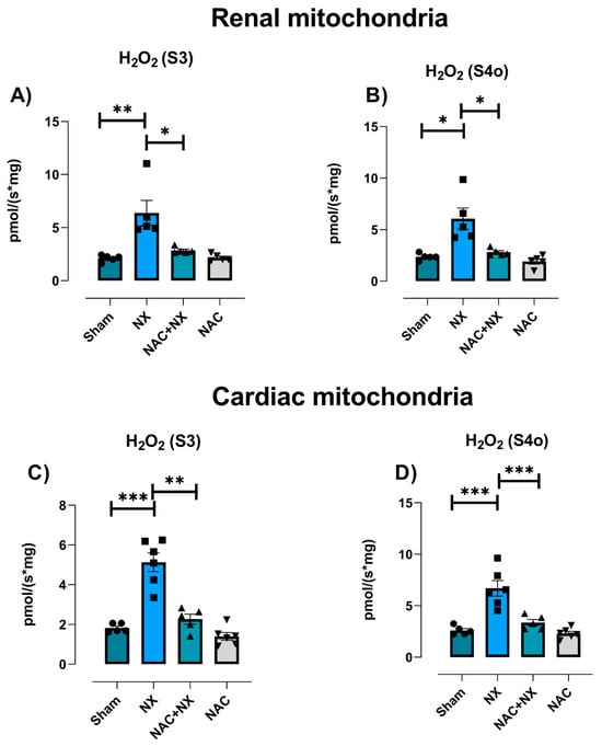 In CKD, mitochondrial respiration impairment has been linked with higher ROS production []. Likewise, reductions in renal and heart mitochondrial CI activity are associated with higher ROS production [,]. Thus, the mitochondrial H2O2 production rate in isolated mitochondria from both organs was evaluated. The NX group’s respiratory rates according to CI + CII-linked activity showed higher rates of H2O2 in S3 and S4o with respect to the Sham group (Figure 9A,B). Interestingly, heart mitochondria also showed higher rates of H2O2 production in both respiratory states (Figure 9C,D). These results suggest that NX induced an overproduction of ROS in high-energy-demand organs.