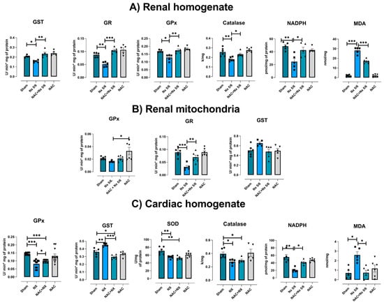 Oxidative stress in the kidneys and heart. Evaluation of the activity of antioxidant enzymes: GR = glutathione reductase, GPx = glutathione peroxidase, catalase, GST = glutathione S-transferase, and SOD = superoxide dismutase. The levels of NADPH (nicotinamide adenine dinucleotide phosphate) and the oxidative stress marker MDA (Malondialdehyde) were reduced as shown in (A) renal homogenates, (B) kidney isolated mitochondria and (C) heart homogenates. Data are the mean ± SEM, with n = 5–6. * p < 0.05, ** p < 0.01, and *** p < 0.001. NX = 5/6 nephrectomy. NAC = N-acetylcysteine.