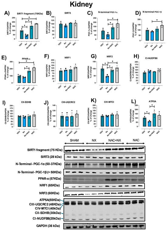 Mitochondrial biogenesis in renal tissue. Evaluation in kidney of mitochondrial biogenesis factors by Western blotting and their densitometry at 10 days after surgery: (A) SIRT1 fragment of 75 KDa, (B) SIRT3, (C) N-terminal-PGC-1α, (D) N-terminal-PGC-1β, (E) PPAR-α, (F) NRF1, (G) NRF2, (H) CI-NDUFB8, (I) CII-SDHB, (J) CIII-UQCRC2, (K) CIV-MTCO1 and (L) ATP5A. GAPDH of the corresponding membranes was used as a protein loading control. Data are the mean ± SEM, with n = 3. * p < 0.05. CI-NDUFB8 = reduced form of the nicotinamide adenine dinucleotide ubiquinone oxidoreductase subunit B8; CII-SDHB = iron-sulfur subunit B of succinate dehydrogenase complex; CIII-UQCRC2 = ubiquinol-cytochrome c reductase core protein 2; CIV-MTCO1 = cytochrome c oxidase subunit I, ATP5A = ATP synthase subunit α; GAPDH = glyceraldehyde-3-phosphate dehydrogenase; NRF1 = nuclear respiratory factor 1; NRF2 = nuclear respiratory factor 2; NX = 5/6 nephrectomy, NAC = N-acetyl-cysteine; PGC-1α = peroxisome proliferator-activated receptor gamma coactivator 1-alpha; PGC-1β = peroxisome proliferator-activated receptor gamma coactivator 1-beta; PPAR-α = peroxisome proliferator-activated receptor alpha; SIRT1 = sirtuin 1; SIRT3 = sirtuin 3.