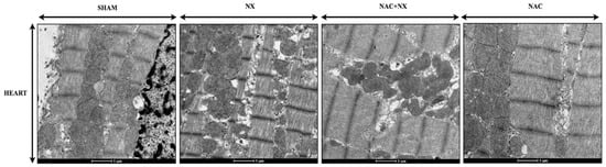 Interestingly, 10 days after NX, heart tissues from the NX group did not show a reduction in mitochondrial biogenesis factors or OXPHOS subunit protein levels (Supplementary Figure S1), suggesting that in heart tissues, bioenergetic alterations (Figure 6, Figure 7 and Figure 8) are not yet associated with impairments in SIRT/PGC-1α/NRFs, as seen in other CRS models at more advanced stages [,]. Interestingly, the electron microscopy evaluation in the heart showed that in the NX group, there are swollen, fragmented and irregular-shaped mitochondria with cristae effacement, without evident changes in organelle number (Figure 12). These findings support the hypothesis that in the heart, early mitochondrial impairment is primarily linked with alterations in bioenergetics rather than changes in biogenesis.