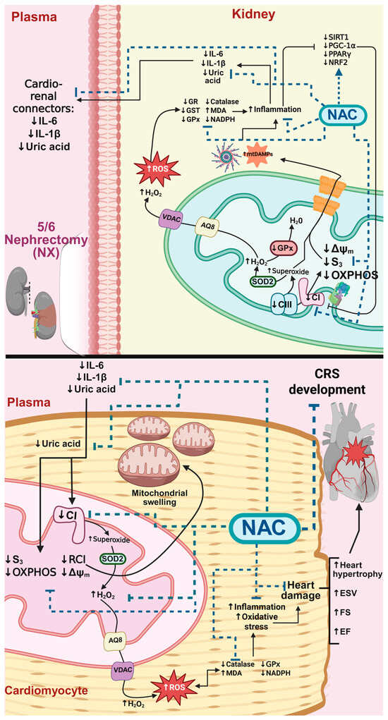 N-acetylcysteine (NAC) administration has been reported to replenish intracellular redox metabolites [], preventing redox imbalance and mitochondrial impairment in renal, cardiac and cardio-renal diseases [,,]. However, current understanding of NAC’s role in modulating mitochondrial redox balance, mainly its role in SIRT1/3 modulation, in the context of CRS-4 is still poor. Thus, this work aims to determine the role of cardiac mitochondrial bioenergetics and SIRT1/3-PGC-1α pathway alterations in renal and heart tissues during CRS-IV development in the early stages in the NX5/6 rat model. In addition, we aim to determine whether the possible prevention of these alterations by NAC is related to its capacity to regulate redox signaling and restore mitochondrial biogenesis in both tissues.