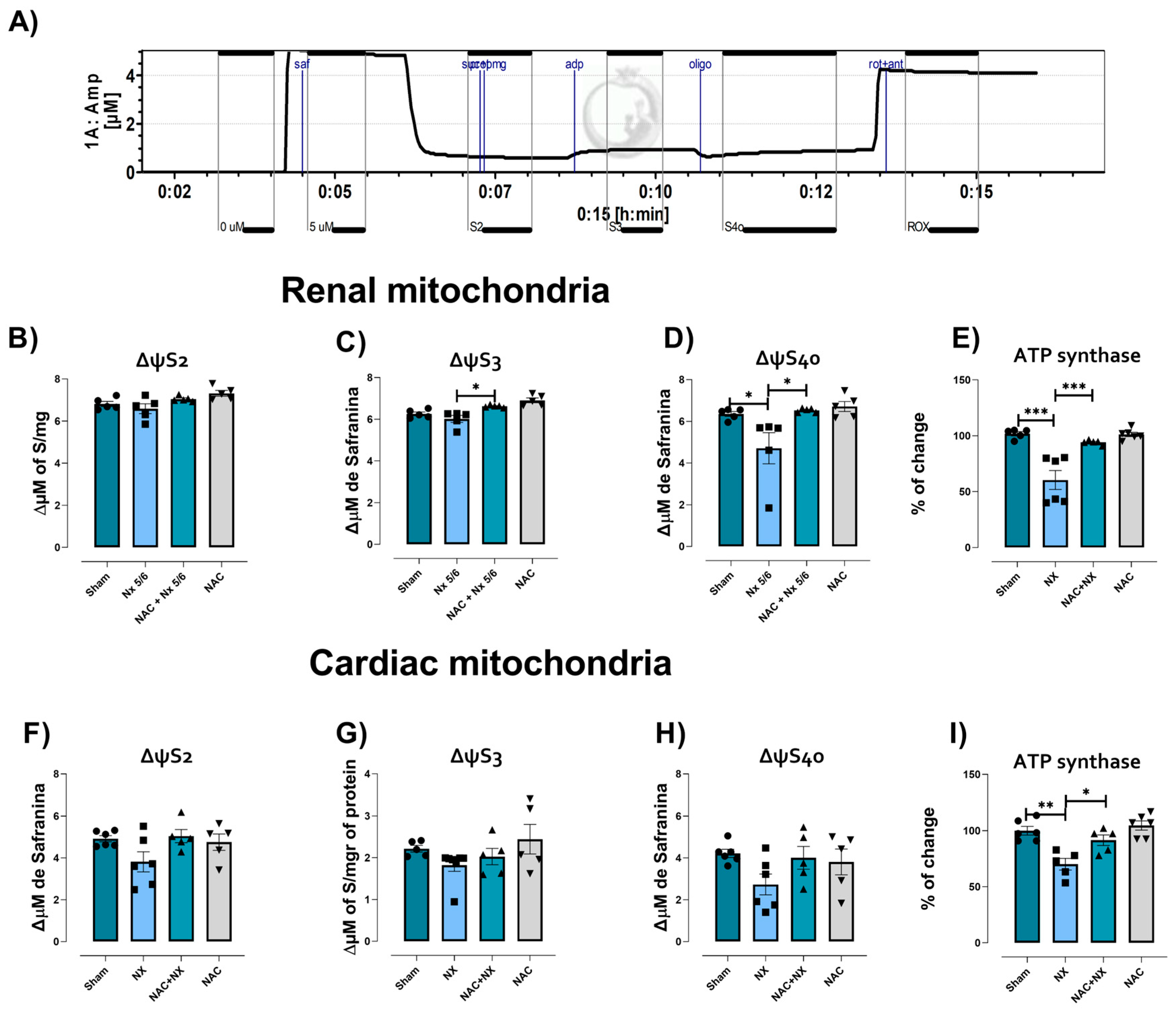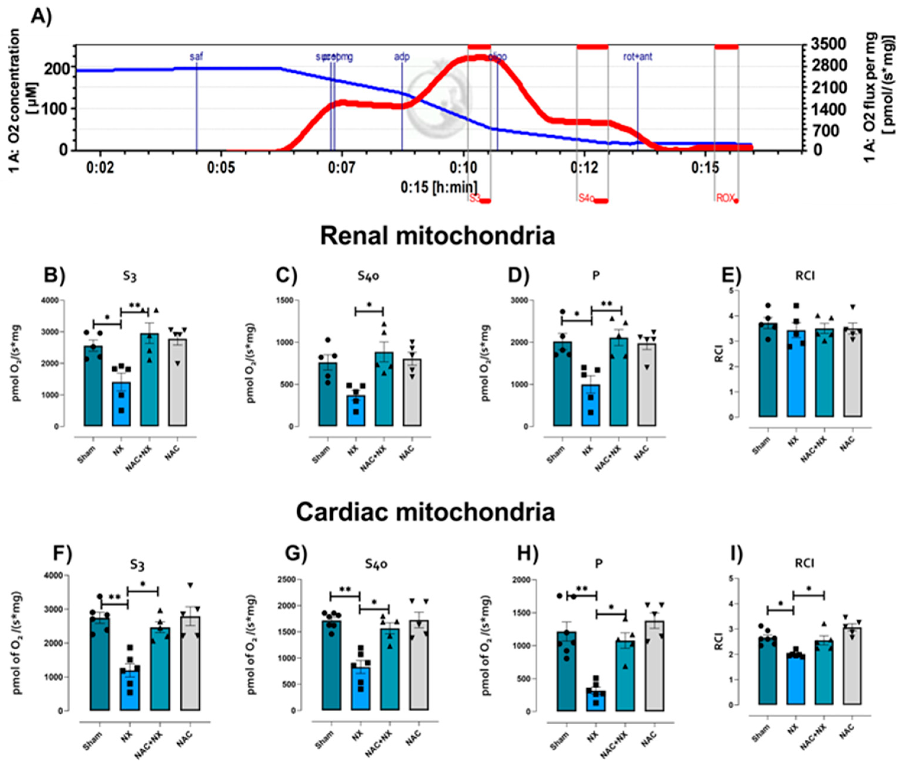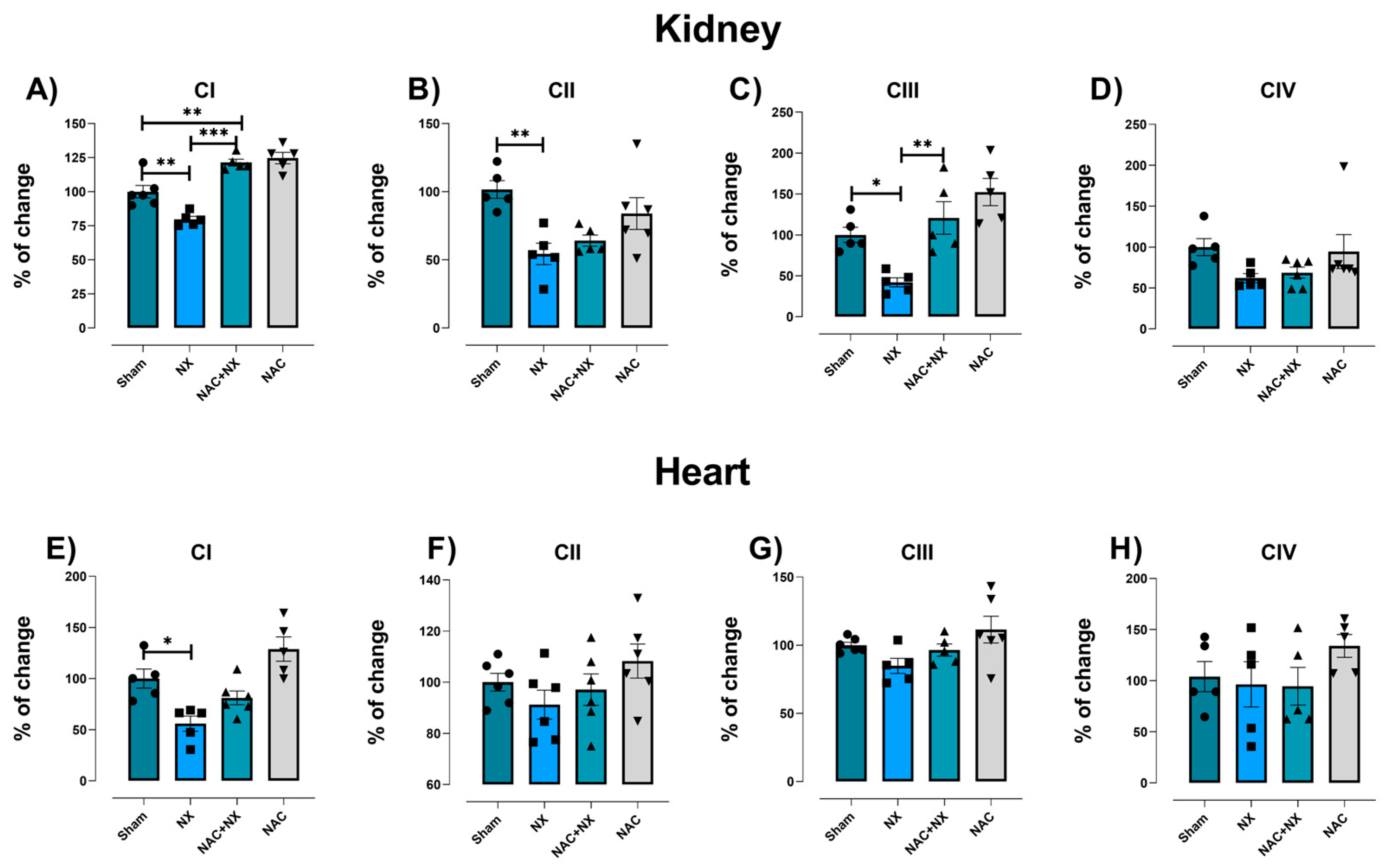 3.2. NAC Prevented Mitochondrial Bioenergetic Impairment in Kidney and Heart