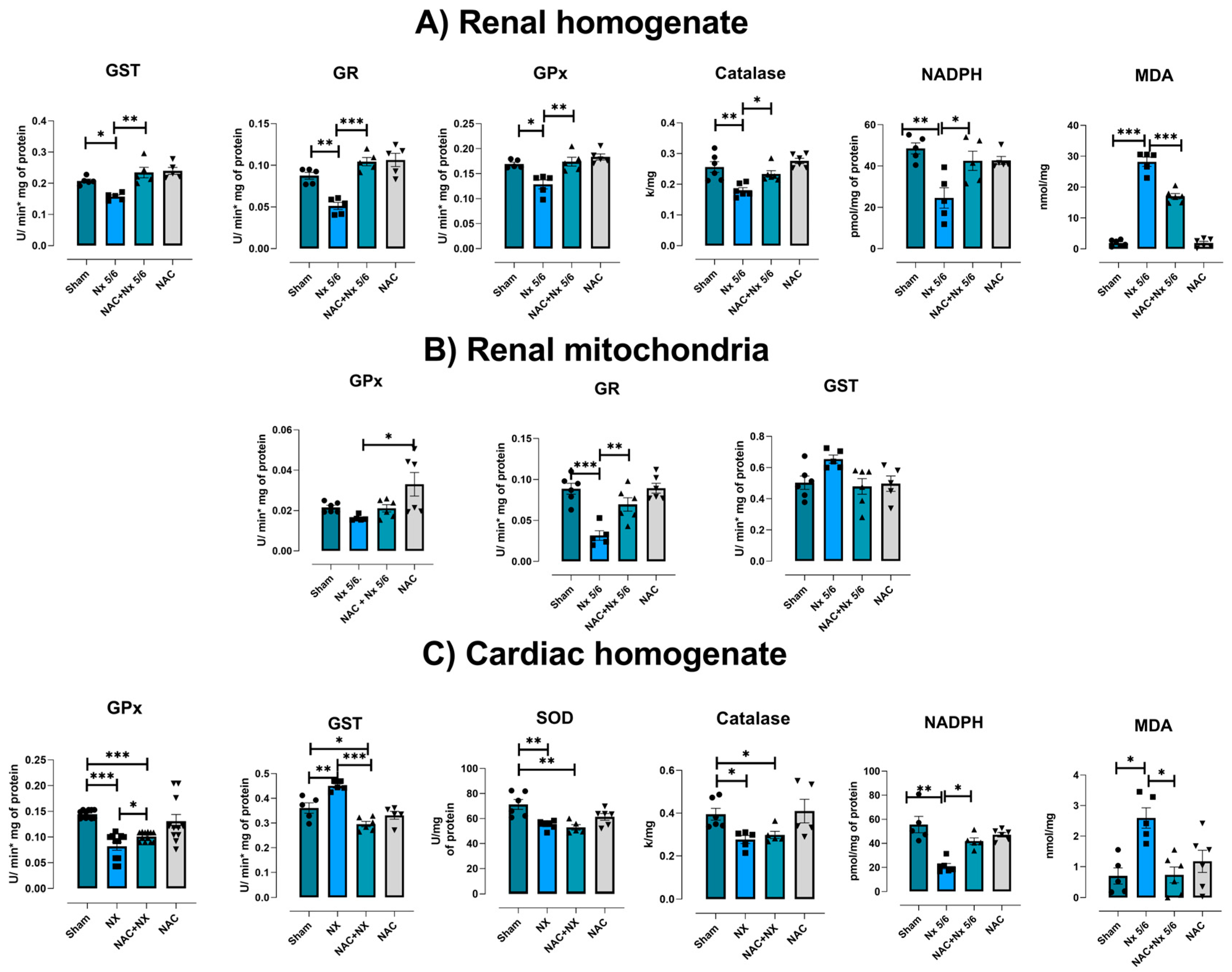 APA StylePeralta-Buendía, K., Cuevas-López, B., García-Arroyo, F. E., Díaz-Rojas, M., León-Contreras, J. C., Silva-Palacios, A., Gonzaga, G., Tapia, E., Saavedra, E., Hernández-Pando, R., Pedraza-Chaverri, J., Sánchez-Lozada, L. G., & Aparicio-Trejo, O. E. (2025). Early Administration of N-Acetylcysteine Provides Renal and Cardiac Mitochondrial and Redox Protection, Preventing the Development of Cardio-Renal Syndrome Type IV Induced by 5/6NX. Antioxidants, 14(10), 1241. https://doi.org/10.3390/antiox14101241