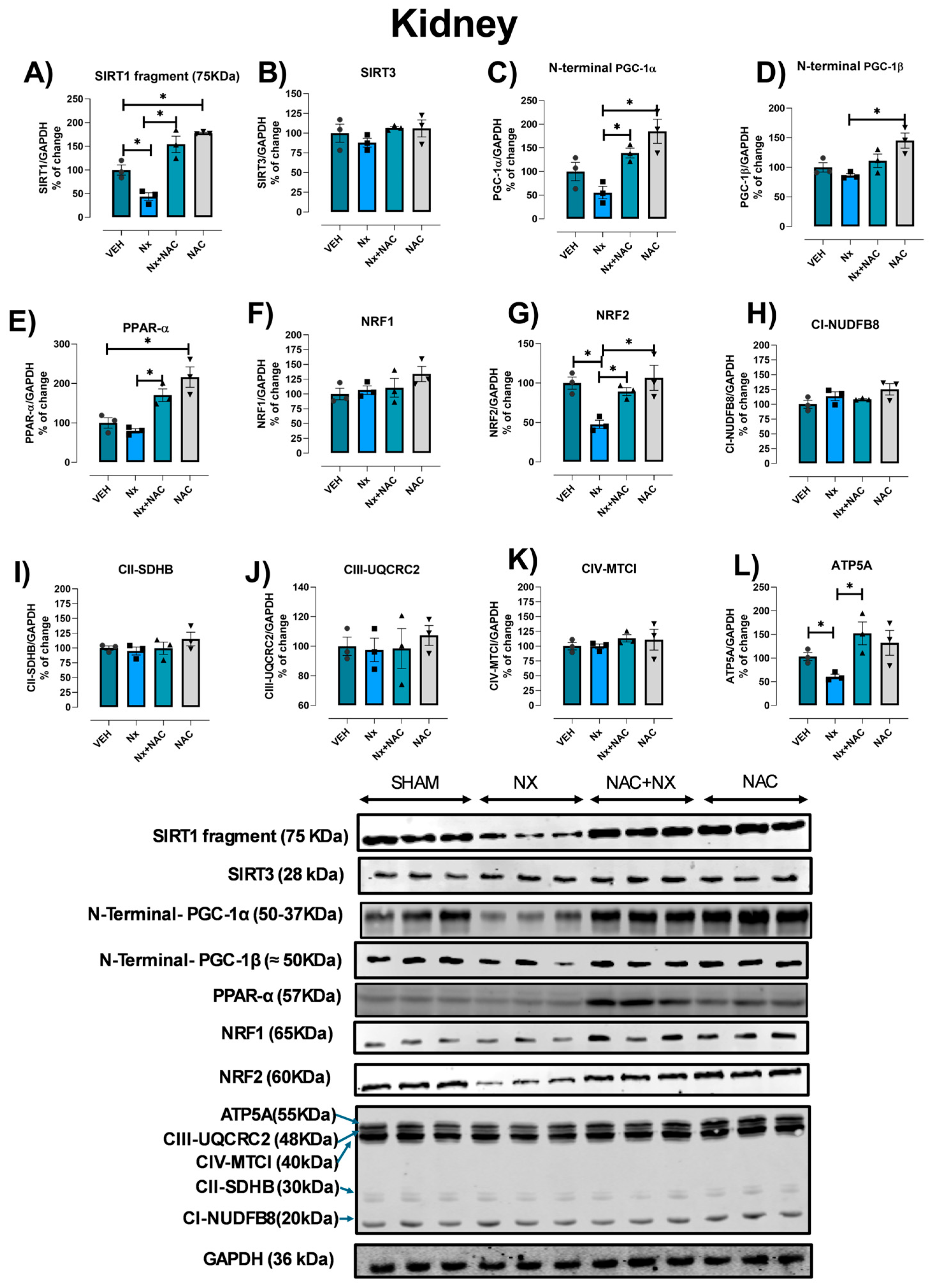 3.4. NAC Prevents Mitochondrial Biogenesis Reduction in Kidney