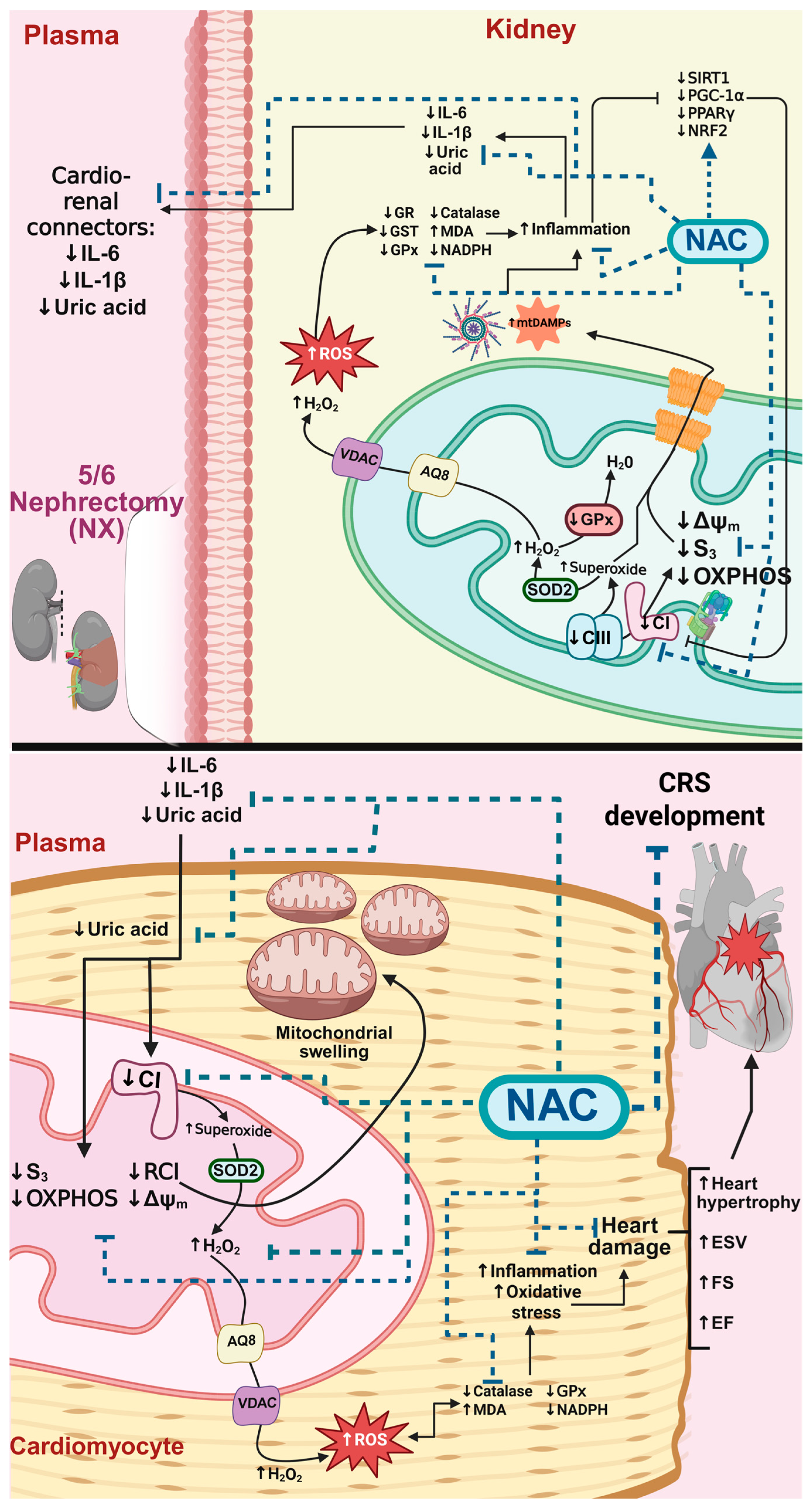 - Cuevas-López, B.; Romero-Ramirez, E.I.; García-Arroyo, F.E.; Tapia, E.; León-Contreras, J.C.; Silva-Palacios, A.; Roldán, F.-J.; Campos, O.N.M.; Hernandez-Esquivel, L.; Marín-Hernández, A.; et al. NAC Pre-Administration Prevents Cardiac Mitochondrial Bioenergetics, Dynamics, Biogenesis, and Redox Alteration in Folic Acid-AKI-Induced Cardio-Renal Syndrome Type 3. Antioxidants 2023, 12, 1592. [Google Scholar] [CrossRef]