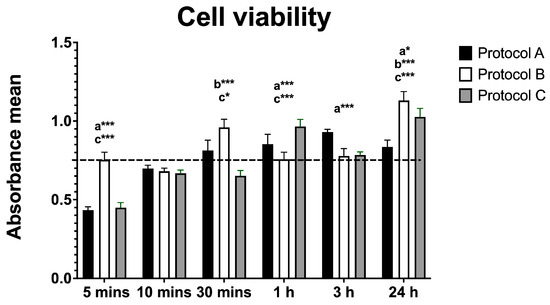 Cell viability analysis (based on mean absorbance values) revealed significant changes across all protocols compared with the control. Protocol A showed an initial decrease in viability at 5 min, followed by significant increases at 1 h and 24 h. Protocol B induced a significant increase at 30 min and again at 24 h, with no significant differences at 1 or 3 h. Protocol C showed an initial decrease in viability at 5 and 30 min, followed by significant increases at 1 h and 24 h, along with a transient decline at 3 h. These results indicate a biphasic effect of irradiation, with early reductions and later enhancements in cell viability, particularly under Protocol C (Figure 1).