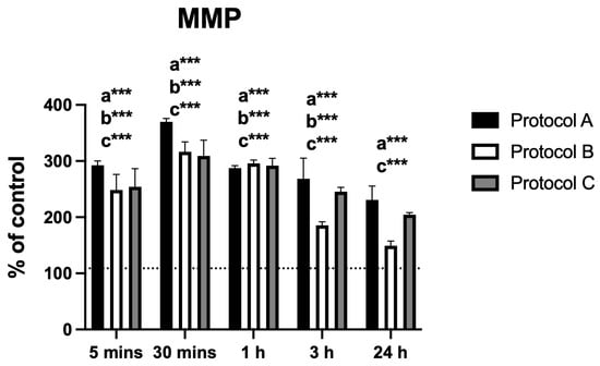 Changes in MMP displayed a pattern similar to that observed for intracellular calcium. Protocol A produced a marked increase in fluorescence intensity at 30 min, followed by a progressive decrease up to 24 h, with significant differences from the control at all time points. Protocol B showed a comparable trend, although the difference at 24 h was not statistically significant. Protocol C also peaked at 30 min and subsequently declined, while maintaining statistically significant differences from the control at all evaluated time points (Figure 5).
