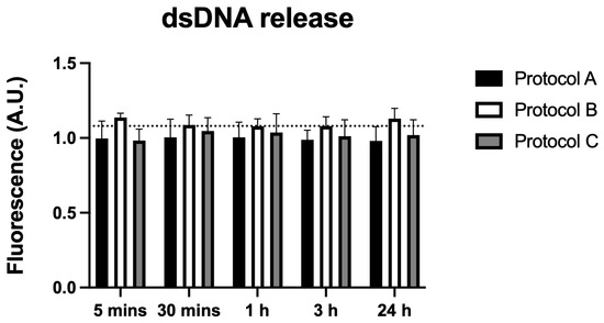 Analysis of extracellular dsDNA levels revealed no statistically significant differences between any irradiated groups and the control across all time points (5 min to 24 h). These findings indicate that the irradiation protocols did not induce dsDNA release, suggesting minimal cellular damage (Figure 7).