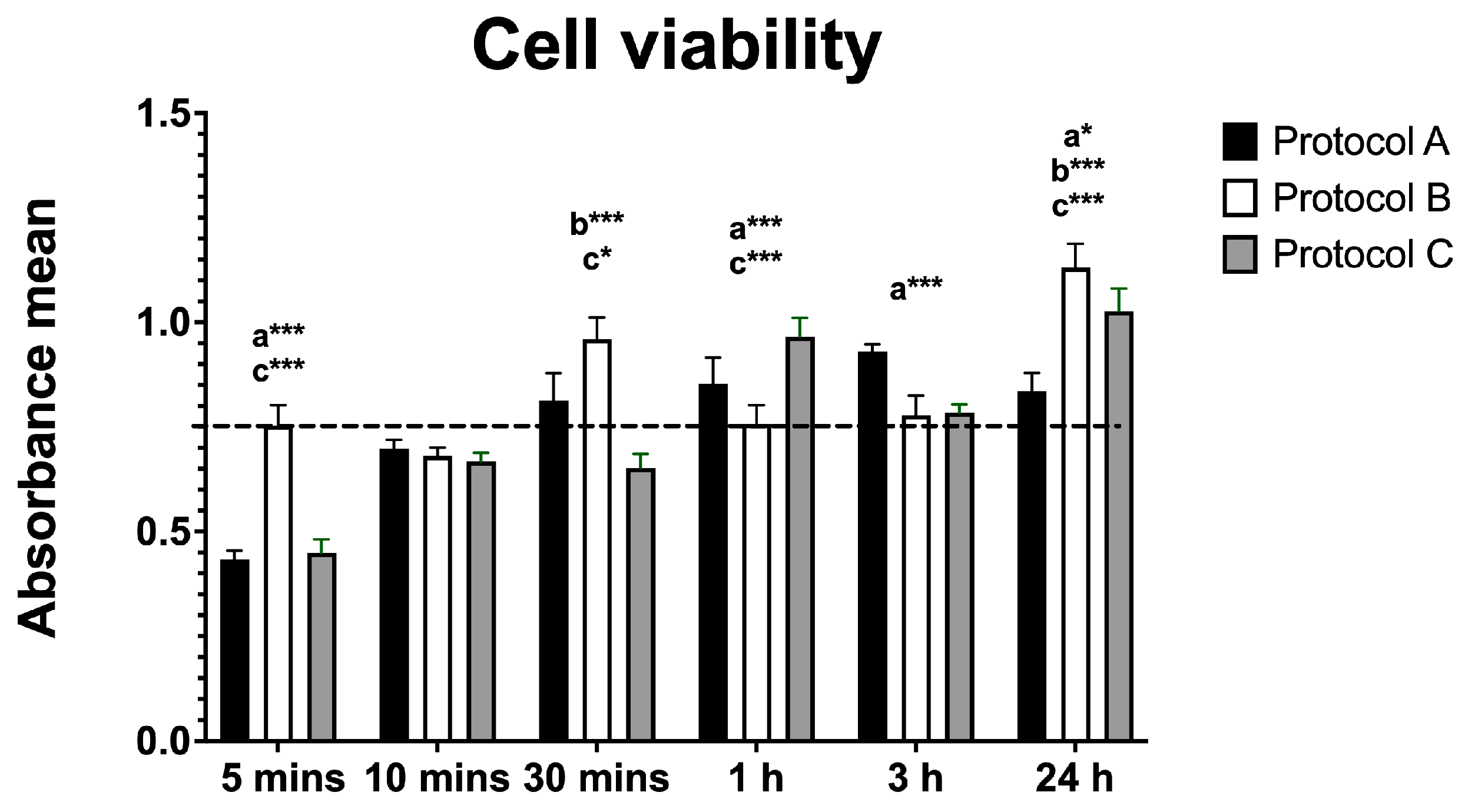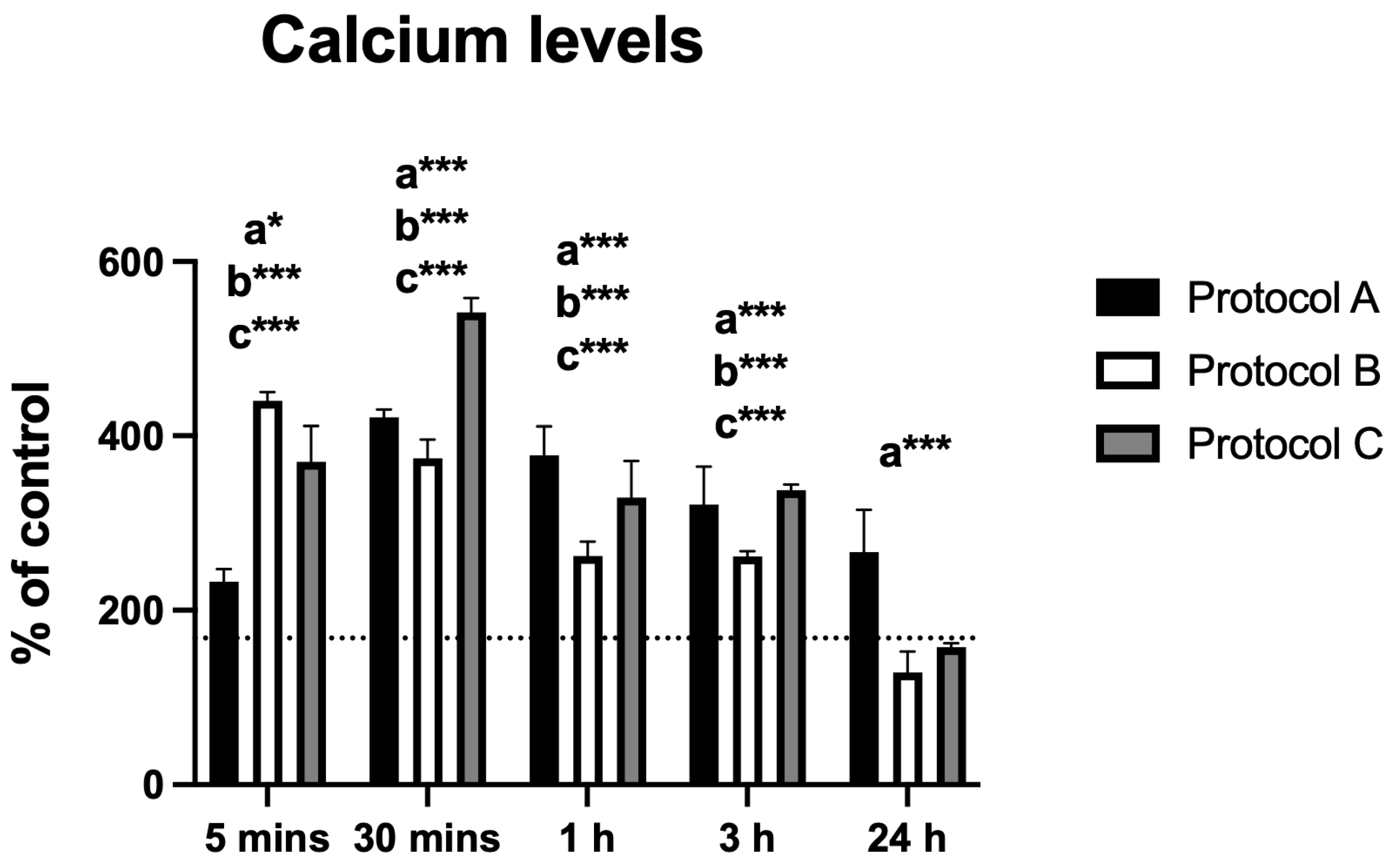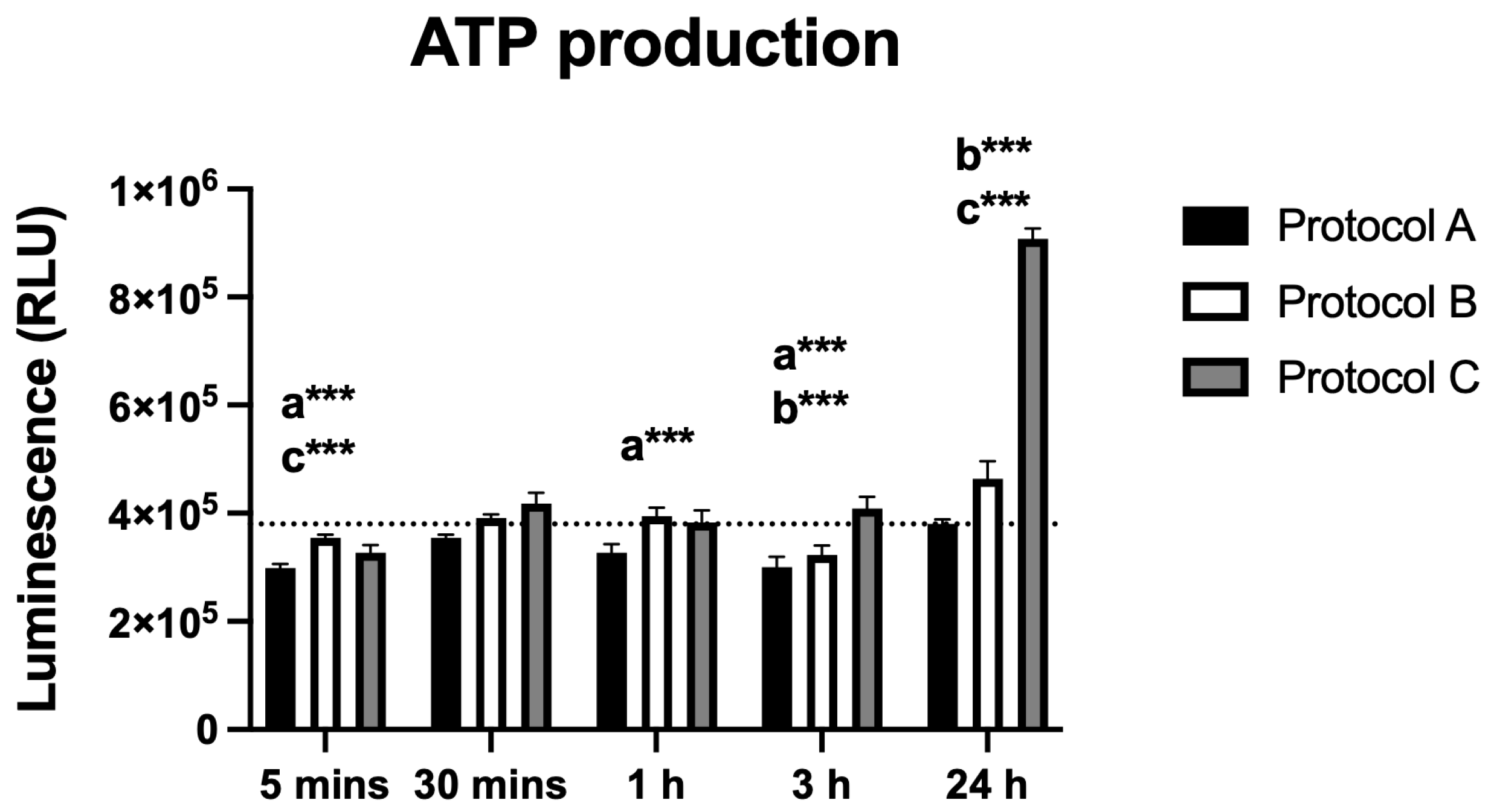 Data are expressed as mean ± SD. Normality was assessed before conducting inferential tests. Given the factorial, between-samples design, outcomes were analyzed using two-way ANOVA (factors: Protocol and Time), followed by Tukey’s post hoc multiple comparisons test. Biological replicates (n) refer to independent experiments performed on different days, with technical triplicates averaged within each experiment. Statistical significance was set at p < 0.05.
