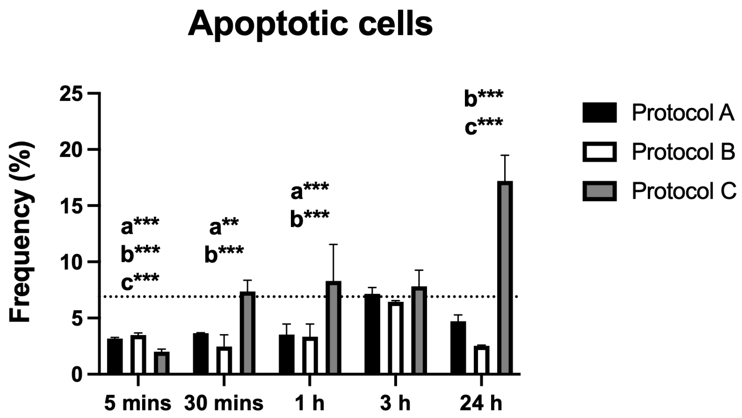 MMP analysis revealed a marked transient hyperpolarization at 30 min in all protocols, indicating an early increase in mitochondrial activity. At 24 h, values tended to return toward baseline, with the most pronounced decline observed in Protocol B (not statistically different from control), whereas Protocols A and C remained significantly elevated compared to control. Decreases or increases in MMP are associated with different cellular mechanisms, including regulation of the cell cycle [