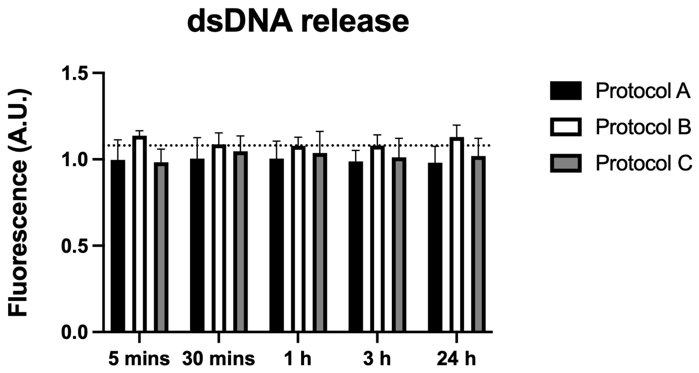 21]. ROS levels were significantly elevated across all protocols, except for Protocol B at 24 h. However, these increases did not exceed thresholds typically associated with oxidative damage, and no evidence of cytotoxicity was observed in parallel assays (cell viability, apoptosis, and dsDNA release). This pattern suggests that the ROS elevations were transient and more likely reflected redox signaling than injurious oxidative stress. Such controlled increases in ROS have been described as triggers of protective and anti-inflammatory pathways [