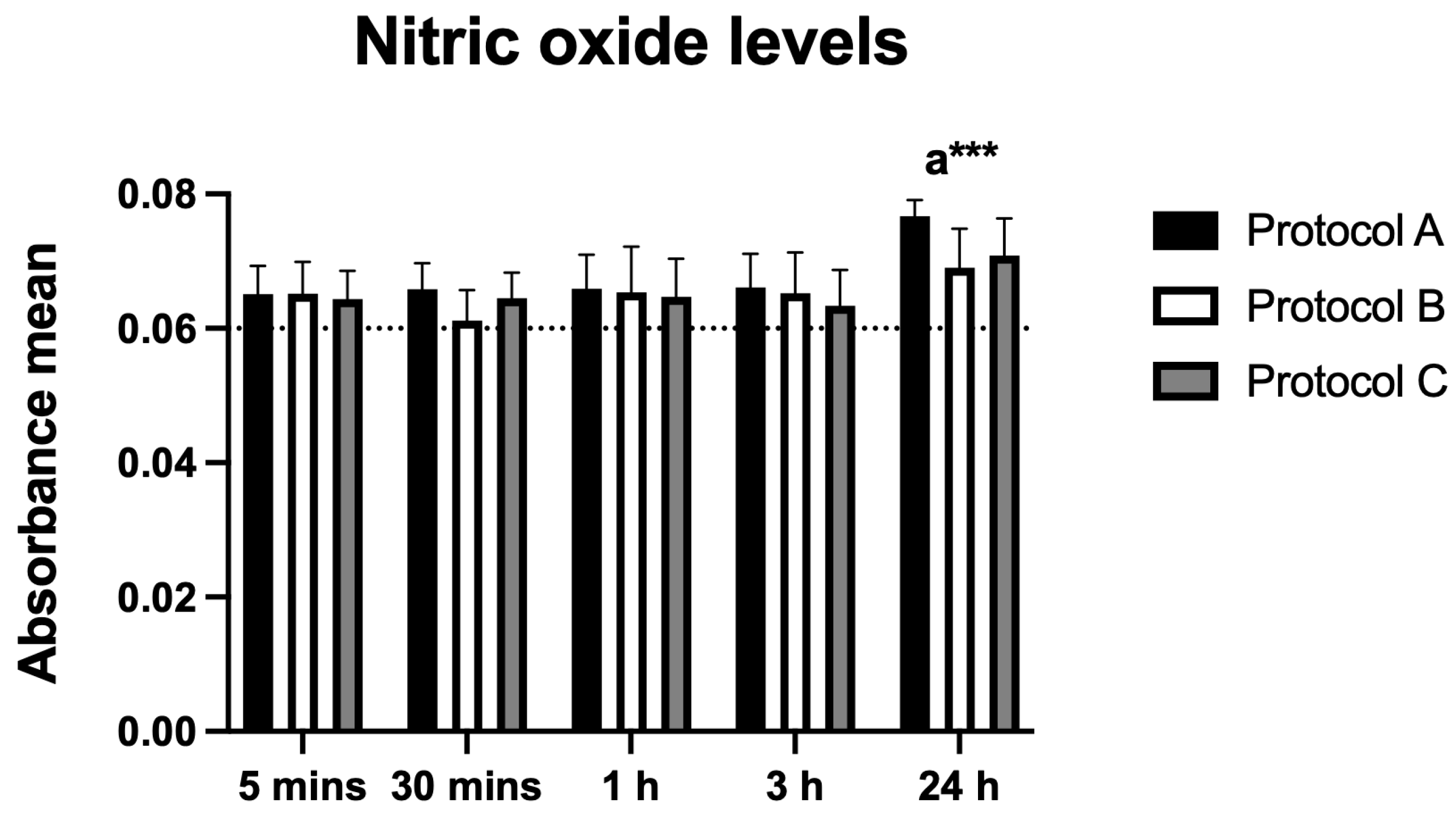 The selective increase in NO in Protocol A after 24 h is also noteworthy. NO, at moderate levels, can modulate neuronal and glial activity, regulate nociceptive synapses, and contribute to neuroprotective and anti-inflammatory effects [