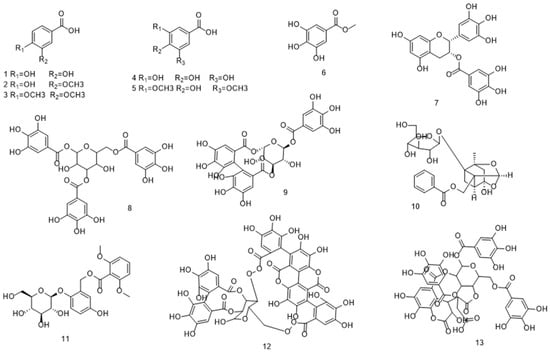 The structure of hydroxybenzoic acid 1. Protocatechuic acid 2. Vanillic acid 3. Veratric acid 4. Gallic acid 5. Syringic acid 6. Methyl gallate 7. EGCG 8. Tannic acid 9. Corilagin 10. Paeoniflorin 11. Curculigoside 12. punicalagin 13. Chebulinic acid.