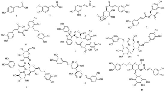 Structure of hydroxycinnamic acid 1. p-Coumaric acid 2. Ferulic Acid 3. Caffeic acid 4. Chlorogenic acid 5. Rosmarinic acid 6. Salvianolic Acid A 7. Salvianolic acid B 8. Acteoside 9. Echinacoside 10. Chicoric acid 11. Plantamajoside.