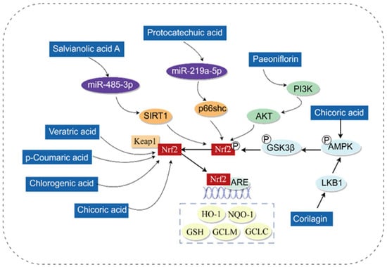 Research has shown that various phenolic acids can alleviate liver damage by activating Keap1/Nrf2 to exert antioxidant effects. For example, p-Coumaric acid, Caffeic acid, Rosmarinic acid, Veratric acid, and Chlorogenic acid can activate Nrf2 and upregulate the expression of downstream antioxidant proteins (HO-1, NQO1, GCLC, and GCLM), thereby playing a hepatoprotective role [28,29,30,31]. In the exploration of the antioxidant mechanism of phenolic acids, it has been found that phenolic acids can also regulate Nrf2 by acting on upstream pathways, including the AMP-activated protein kinase (AMPK)/Glycogen synthase kinase 3β (GSK3β) and Phosphoinositide 3-kinase (PI3K)/Protein kinase B (AKT) signaling pathways. Both chicoric acid and corilagin can increase the levels of Phospho-AMP-activated protein kinase α (P-AMPKα) and Phospho-Glycogen synthase kinase 3β (P-GSK3β), thereby activating Nrf2 and alleviating Lipopolysaccharides (LPS)/D-Galactosamine (GalN)-induced Acute liver failure (ALF) and Acetaminophen(APAP)-induced hepatotoxicity [32,33]. Paeoniflorin activates Nrf2 through the PI3K/AKT-dependent pathway, improving Alpha-Naphthylisothiocyanate (ANIT)-induced cholestatic liver injury in rats [34]. In addition, phenolic acids can exert antioxidant effects by targeting MicroRNA (miRNA). For instance, protocatechuic acid can reduce the formation of ROS through the MicroRNA-219a-5p (miR-219a-5p)/p66shc signaling pathway, thereby alleviating ALD [35]. Salvianolic acid A regulates the MicroRNA-485-3p (miR-485-3p)/Sirtuin 1 (SIRT1) pathway to mitigate APAP-induced oxidative stress [36].