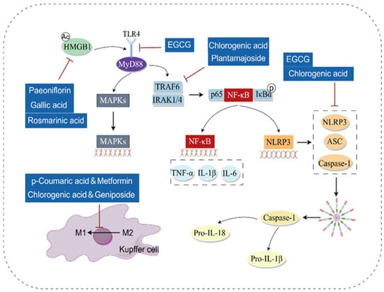(1) A variety of phenolic acids can reduce liver inflammation by inhibiting the TLR4/NF-κB pathway. For example, Chlorogenic acid and EGCG alleviate liver inflammation by directly inhibiting TLR4, thereby slowing the progression of nonalcoholic steatohepatitis (NASH) and liver injury caused by Pseudomonas aeruginosa infection [42,43]. Plantamajoside and chlorogenic acid inhibit the expression of Interleukin-1 Receptor-Associated Kinase 1 (IRAK1) and TNF Receptor-Associated Factor 6 (TRAF6), preventing NF-κB from translocating into the nucleus. This reduces the mRNA transcription of inflammatory factors and alleviates liver inflammation [44,45]. Protocatechuic acid and punicalagin can decrease the levels of pro-inflammatory cytokines such as Interleukin-6 (IL-6) and Tumor necrosis factor-α (TNF-α), thereby improving liver injury [40,46].