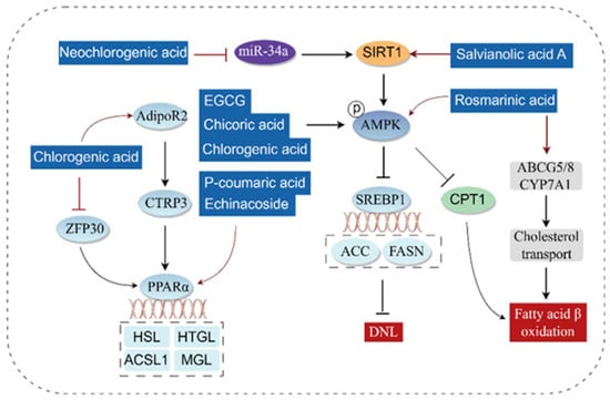 After FAs in the liver bind non-covalently to Fatty Acid Binding Protein-1 (FABP-1), CPT1 converts them into acylcarnitines, which are then shuttled into mitochondria. There, these acylcarnitines undergo β-oxidation to produce energy [58]. As a cellular “energy sensor”, the activation of AMPK phosphorylates and inhibits the activity of Acetyl CoA Carboxylase (ACC), leading to a decrease in malonyl-CoA levels. This, in turn, relieves the inhibition of CPT1 activity and promotes FAs entry into mitochondria for β-oxidation [59]. Combined treatment with metformin and p-coumaric acid, as well as rosmarinic acid, can promote FAs β-oxidation by activating AMPK-mediated CPT1 [53,60]. At the cellular level, studies have also shown that arctigenin chlorogenic acid from burdock roots enhances FAs β-oxidation through the AMPK/ACC/CPT1 pathway, thereby alleviating oleic acid-induced steatosis in Human Hepatoma G2 (HepG2) cells [61]. SIRT1 is a class III Nicotinamide Adenine Dinucleotide (NAD+)-dependent histone/protein deacetylase. A decrease in its activity may reduce the deacetylation of LKB1 and inhibit this kinase [62], which in turn regulates the activation of AMPK [63] and ultimately affects FAs metabolism. Salvianolic acid A upregulates the protein levels of phosphorylated AMPK and SIRT1 in a dose-dependent manner, improving hepatic lipotoxicity in mice with fatty liver [64]. Neochlorogenic acid alleviates lipid accumulation by downregulating MicroRNA-34a (miR-34a), thereby activating the SIRT1/AMPK pathway to improve oleic acid-induced intracellular lipid accumulation [65].