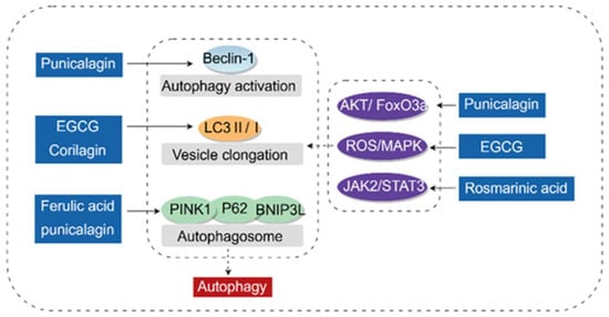 (4) Beyond directly regulating autophagy-related proteins, in-depth studies have shown that certain phenolic acid components can also regulate autophagy by acting on signaling pathways such as AKT/Forkhead box O3 (FoxO3a), ROS/MAPK, and Janus kinase 2 (JAK2)/Signal transducer and activator of transcription 3 (STAT3). Punicalagin inhibits the phosphorylation of AKT/FoxO3a, upregulates the expression of the autophagy-related protein LC3B, and downregulates p62 expression, thereby protecting against liver injury induced by type 2 diabetes [94] and CCl4 [39]. EGCG promotes autophagy via the ROS/MAPK pathway [95]. Rosmarinic acid enhances autophagy by acting on the JAK2/STAT3 pathway [96].