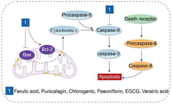 Apoptosis is the primary mode of cell death in various liver diseases, characterized by an increased protein degradation rate [98,99] and elevated caspase activity [100]. Caspase activation can be triggered by two well-characterized apoptotic pathways: the mitochondria-mediated (intrinsic) pathway and the cell surface death receptor (extrinsic) pathway [101]. Phenolic acids mainly exert anti-apoptotic effects by activating the intrinsic pathway.