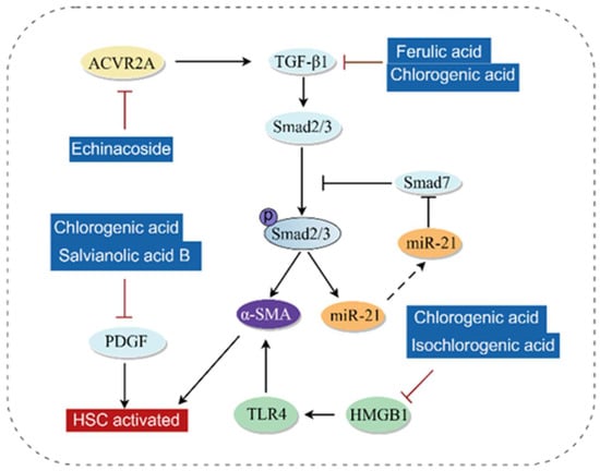 Liver fibrosis is caused by excessive production of the extracellular matrix (ECM) and abnormal deposition of fibrous connective tissue in the liver. The massive production and activation of myofibroblasts (MFBs)—which secrete components including collagen, α-smooth muscle actin (α-SMA), and tissue inhibitor of metalloproteinases 1 (TIMP1) [114,115]-are critical to the progression of liver fibrosis, and MFBs mainly originate from the activation of HSCs. Studies have shown that phenolic acids can exert anti-fibrotic effects by regulating the transforming growth factor β (TGF-β)/Smad pathway, HMGB1/TLR4/NF-κB pathway, and targeting the platelet-derived growth factor receptor (PDGFR).