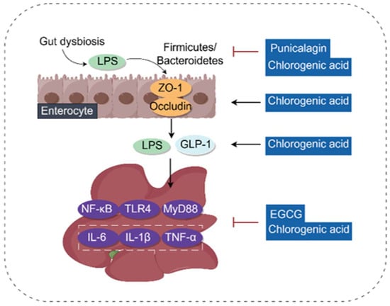 Many phenolic acids contribute to this multifaceted and dynamic host microbe symbiosis. EGCG [138], punicalagin [92], Chicoric Acid [29], TLP-H [139] (gallic acid, corilagin and chebulagic acid) and Chlorogenic [140] can reduce the ratio of Firmicutes/Bacteroidetes and decrease the abundance of co-bacteria and anaerobic bacteria. Caffeic acid also helps balance intestinal microbiota dysbiosis associated with LPS [141]. TLP-H, EGCG, and Chlorogenic acid can also significantly alleviate intestinal dysbiosis and liver inflammation by inhibiting the activation of the TLR4/MyD88/NF-κB signaling pathway, thereby alleviating liver injury [139,140,142]. Chlorogenic acid can increase the expression of occludin and zonula occludens-1 (ZO-1) in intestinal tissues to regulate the intestinal microbiota; in addition, it can reduce the level of LPS in the portal vein and increase the level of glucagon-like peptide-1 (GLP-1) to exert anti-inflammatory effects [30].
