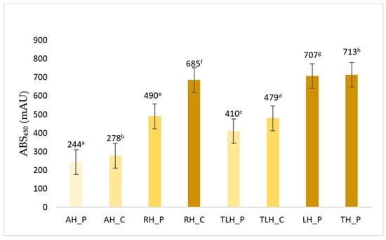 Color intensity (ABS450, mAU) of different honey samples measured at 50% w/v dilution. Data are presented as mean ± standard deviation (n = 3). Distinct superscript letters denote statistically significant differences between samples (p < 0.05). Sample codes are defined as follows: AH_P—acacia honey from producer; AH_C—acacia honey from commercial source; RH_P—rapeseed honey from producer; RH_C—rapeseed honey from commercial source; TLH_P—linden honey from producer; TLH_C—linden honey from commercial source; LH_P—lavender honey from producer; TH_P—thyme honey from producer.