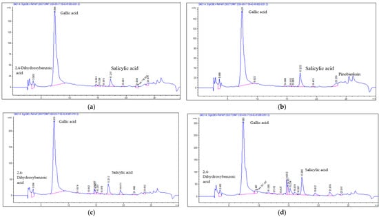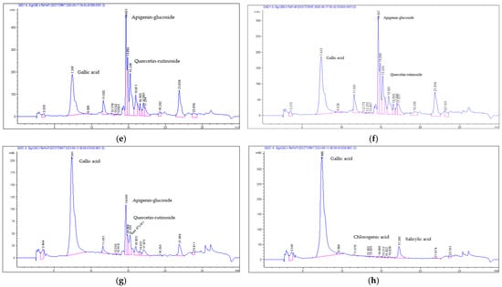 Figure 2a–h consisted of the HPLC chromatograms at 340 nm for each honey sample, where distinct profiles were observed. Linden honey showed prominent peaks corresponding to flavonoid glycosides (like rutin and quercetin glycoside) (Figure 2e,f), whereas thyme honey’s chromatogram had a dominant gallic acid peak and other phenolic acids (Figure 2h).