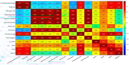 Pearson correlation matrix between phenolic compounds identified by HPLC (concentration > 1 mg/100 g), total phenolic acids, total flavonoids, color intensity (ABS450), and antioxidant activity parameters (DPPH, ABTS, FRAP). Pearson’s correlation coefficient (r) ranges from −1 to +1, indicating the strength and direction of the linear relationship between variables. Strong positive correlations (r ≥ 0.71) were represented in dark red, while strong negative correlations (r ≤ −0.71) appeared in dark blue. Moderate positive correlations were shown in shades of orange to yellow, whereas moderate negative correlations were represented in light bluish tones. Weak or no correlations (r between −0.30 and 0.30) appeared in light green.