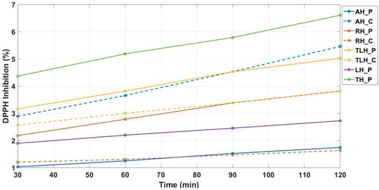 Time-dependent evolution of DPPH radical scavenging activity (%); AH_P—acacia honey from producer; AH_C—acacia honey from commercial source; RH_P—rapeseed honey from producer; RH_C—rapeseed honey from commercial source; TLH_P—linden honey from producer; TLH_C—linden honey from commercial source; LH_P—lavender honey from producer; TH_P—thyme honey from producer.