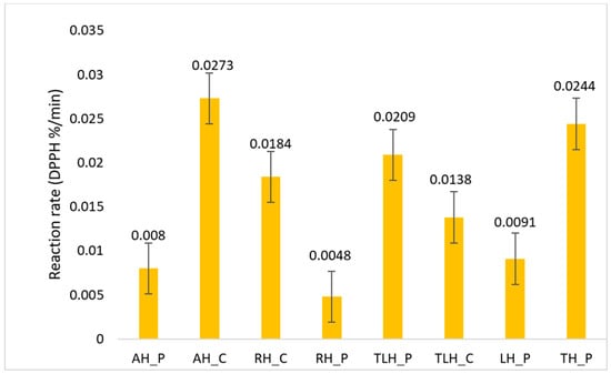 Antioxidant reaction rate of different honey types (DPPH %/min); AH_P—acacia honey from producer; AH_C—acacia honey from commercial source; RH_P—rapeseed honey from producer; RH_C—rapeseed honey from commercial source; TLH_P—linden honey from producer; TLH_C—linden honey from commercial source; LH_P—lavender honey from producer; TH_P—thyme honey from producer.