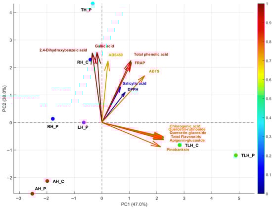 The Pearson correlation matrix revealed distinct linear relationships among the analyzed variables. Among the strongest positive correlations were those observed between gallic acid and the parameters total phenolic acid (r = 0.83), FRAP (r = 0.75) and ABS450 (r = 0.80), suggesting that gallic acid is one of the main contributors to the overall antioxidant potential and color intensity. Similarly, 2,4-dihydroxybenzoic acid showed a close association with the same parameters (total phenolic acid r = 0.77, FRAP r = 0.73, ABS450 r = 0.83). Total phenolic acid, calculated as the sum of individual phenolic compounds detected by HPLC, showed strong correlations with ABTS (r = 0.86) and FRAP (r = 0.91).