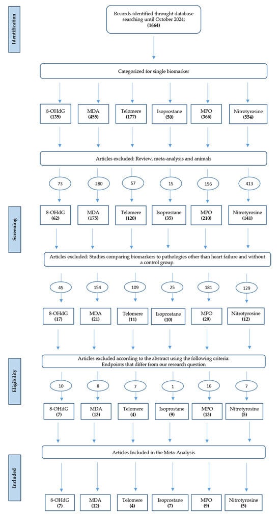 Following screening, reviews, meta-analyses, and animal studies were excluded (73 for 8-OHdG, 280 for MDA, 57 for telomeres, 15 for isoprostanes, 156 for MPO, and 413 for nitrotyrosine). Additional exclusions were made for studies without a control group or focused on diseases other than HF (45 for 8-OHdG, 154 for MDA, 109 for telomeres, 25 for isoprostanes, 181 for MPO, and 129 for nitrotyrosine).