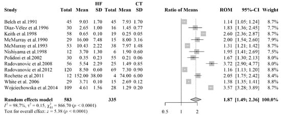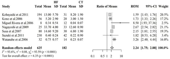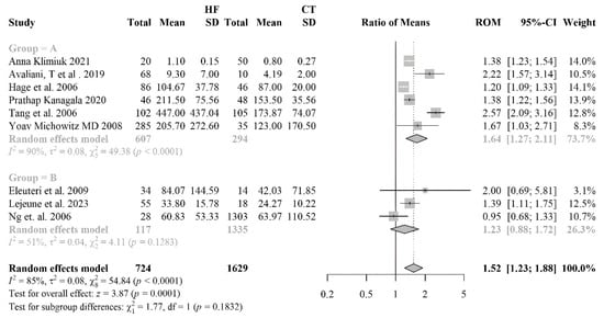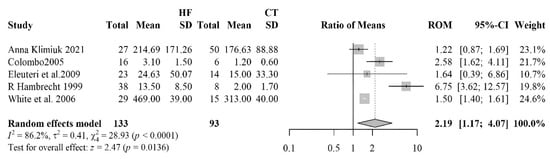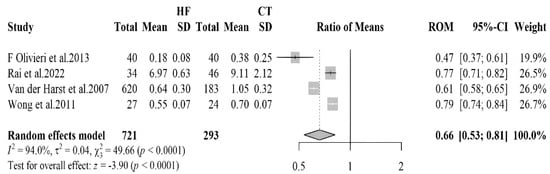Given that the assumptions for using a fixed-effect model are often too restrictive, a random-effects model generally was applied. This approach accounts for between-study variability arising from differences in treatment, population, study design, and data analysis methods. The measure of effect estimated by random-effects models to compare biomarker levels between the two groups with the Ratio of Means (ROM). Heterogeneity was quantified using the I2 statistic, accompanied by the τ2 statistic to estimate between-study variance. Based on the χ2 statistic, the Q test was used to detect heterogeneity, applying a significance level of 0.10 due to the reduced power of this test in meta-analyses with a limited number of studies.