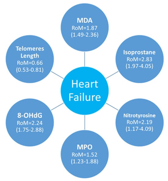 Various biomarkers have been identified and utilized to evaluate these processes, for example, malondialdehyde (MDA) is a highly reactive dialdehyde generated as an end-product of lipid peroxidation of membrane polyunsaturated fatty acids (PUFAs) in response to free radicals and ROS [19]. Additionally, 8-hydroxy-2′-deoxyguanosine (8-OHdG) is a predominant form of ROS lesions found in both nuclear and mitochondrial DNA, often used as a biomarker for oxidative stress [20]. Another commonly used biomarker is myeloperoxidase (MPO). Human MPO is a homodimeric protein that contributes to oxidative stress through the production of ROS and other oxidative molecules such as HOCl [21]. Several biomarkers are used in research to quantify and identify oxidative stress and DNA damage, as well as inflammation and other pathological processes. In the field of HF, these biomarkers have been discovered and used over the past 30 years, allowing for a deeper understanding of the molecular and cellular dynamics that contribute to the progression of the disease. The present systematic review and meta-analysis sought to critically evaluate published evidence on biomarkers related to oxidative stress in HF patients. Through the analysis of these biomarkers, it is possible to reconstruct the pathophysiology of oxidative stress and DNA damage in the context of HF and understand how these processes contribute to the exacerbation of the disease. This systematic review and meta-analysis aim to critically evaluate the current evidence on biomarkers of oxidative stress and DNA damage in HF patients. By quantifying alterations in these biomarkers, the study seeks to elucidate their pathophysiological roles in HF progression, distinguish their relevance across different HF phenotypes, and assess their potential utility for diagnosis, prognosis, and therapeutic monitoring. Through this analysis, it is also possible to reconstruct the mechanisms underlying oxidative stress and DNA damage in HF and to understand how these processes contribute to disease exacerbation. This study is innovative as it provides the first systematic meta-analysis of oxidative stress and DNA damage biomarkers in heart failure, offering a multidimensional view beyond natriuretic peptides. By integrating genomic, lipid, and protein markers, it advances understanding of disease mechanisms and prognostic potential. The inclusion of genomic instability markers highlights new opportunities for risk stratification, personalized treatment, and precision rehabilitation.