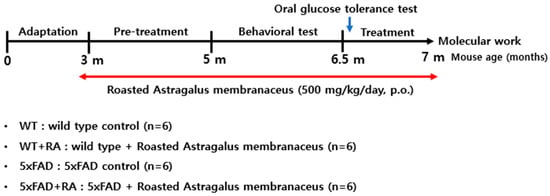 Based on our preliminary tests comparing the effects of Astragali radix and RA, we decided to test the efficacy of water-extracted RA in an AD model using mice. We anticipated that RA would inhibit cognitive symptoms related to β-amyloid accumulation in 5xFAD mice.